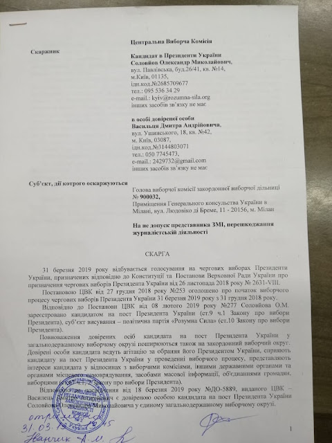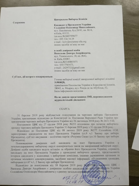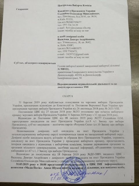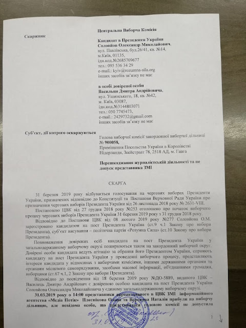 Информация о проблемах на зарубежных участках поступила практически сразу после открытия. На зарубежных участках приняло участие более 55 000 избирателей, с одной стороны немного, а с другой это ресурс для покрытия разницы в голосах на территории Украины, ведь контроль на зарубежных участках минимальный. На зарубежных участках массово фиксировали препятствие волеизъявлению граждан Украины со стороны сотрудников посольств, процедуру голосования намеренно затягивали. Посмотрев на результаты голосования на участках, где были зафиксированы нарушения, мы увидим аномально высокую явку и высокий процент голосов за П.Порошенко. На зарубежном округе победил П.Порошенко, что в корне отличается от ситуации по Украине. На это повлияло несколько факторов, во-первых, отсутствие контроля за процессом голосования и подсчетом голосов, ведь члены зарубежных комиссий формировались из сотрудников посольств которые в прямом подчинении у П.Порошенко. Понимая этот факт, на участки пытались попасть представители СМИ и наблюдатели от кандидатов в Президенты. У наблюдателей и представителей СМИ отбирали телефоны, не пускали на территорию посольств где проходило голосование, выталкивали с участков и вызывали местную полицию. Штабом Александра Соловьева были поданы жалобы в ЦИК на действия членов зарубежных комиссий в Германии, Испании, Италии и Нидерландах. ЦИК в свою очередь оставили без рассмотрения данные жалобы по формальным причинам, тем самым покрывая те, махинации которые происходили на зарубежных участках, ведь для П.Порошенко был дорог каждый вброшенный голос.