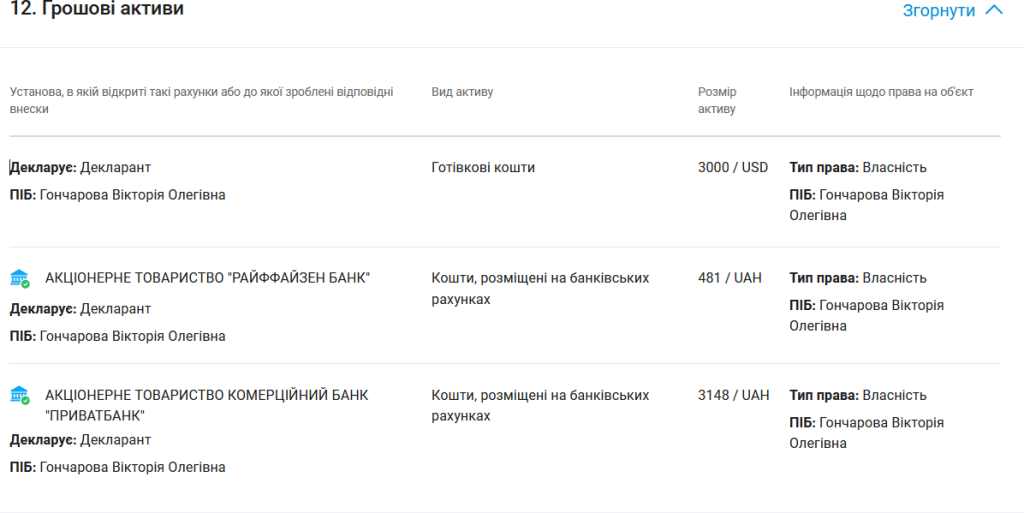 Стосовно грошових активів теж комар носа не підточить. Хіба що цьогоріч Гончарова Вікторія Олегівна законослухняно вказала дохід від відчуження рухомого майна на суму 1 885 500 грн. Та ще фігурує автомобіль легковий VOLVO XC90 (а зовсім не Bentley люкс-класу) 2018 року випуску, який власники оцінили в 877 500 грн. А так все виглядає просто зразково.