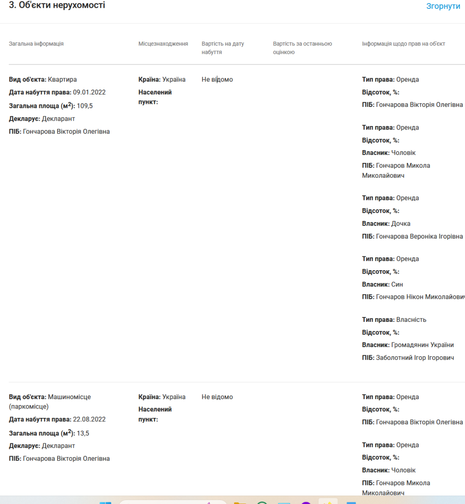 Власником квартири, де сьогодні живе Вікторія Гончарова є теж не дуже публічна людина – Заболотний Ігор Ігорович. Про нього відомо, що свого часу він обіймав посаду заступника прокурора Донецької області та був звільнений з посади в порядку люстрації. І за даними ПФУ, після 2014 року ніде офіційно не працював.