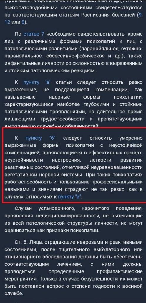 Клінічна картина пацієнта була складною. Військово-лікарська комісія свого часу винесла невтішний вердикт: стаття 7-б. Для тих, хто не знайомий з розкладом хвороб: це різко виражені психопатії або стани з нестійкою компенсацією. Простіше кажучи, в армію таку людину брати небезпечно – ніколи не знаєш, в який бік буде стріляти, куди бігти, і що йому підкажуть голоси у його голові.