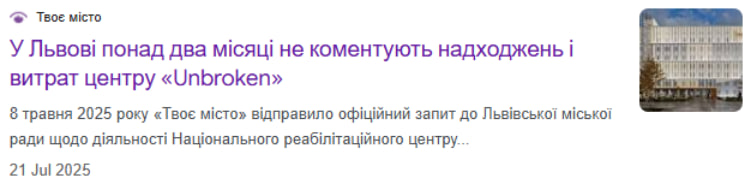 21 липня 2025 року вийшла розгромна стаття «У Львові понад два місяці не коментують надходжень і витрат центру “Unbroken”». Якщо ви спробуєте знайти її на сайті зараз — побачите лише помилку “404 Not Found”. Очевидно що публікацію було по-тихому знято за гроші. Хтось дуже впливовий проплатив “зачистку” інформаційного поля, щоб сховати свої оборудки. Але організатори цієї цензури забули, що інтернет пам’ятає все — повний текст матеріалу успішно відновлено через бази веб-архіву.